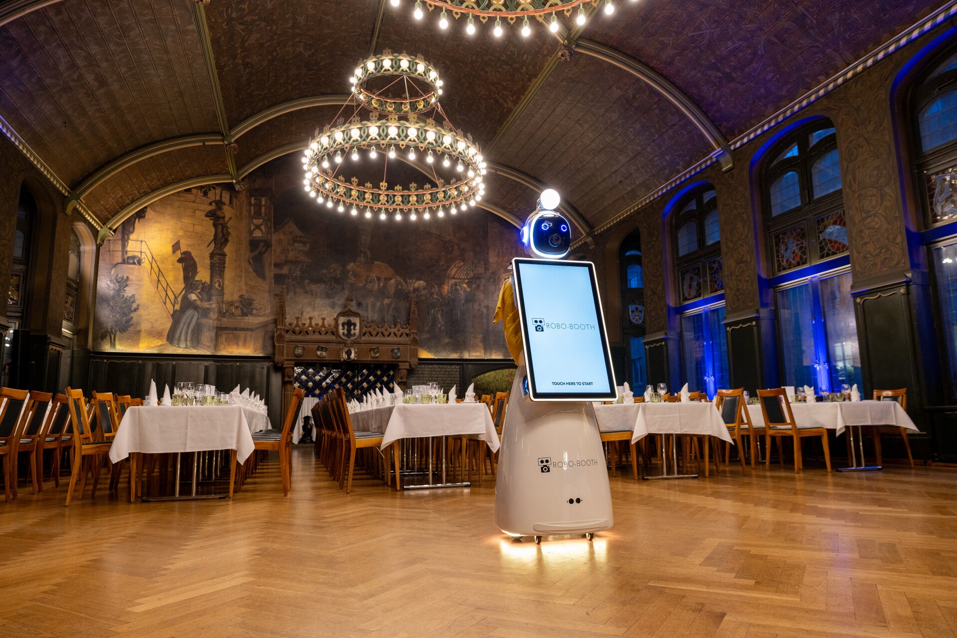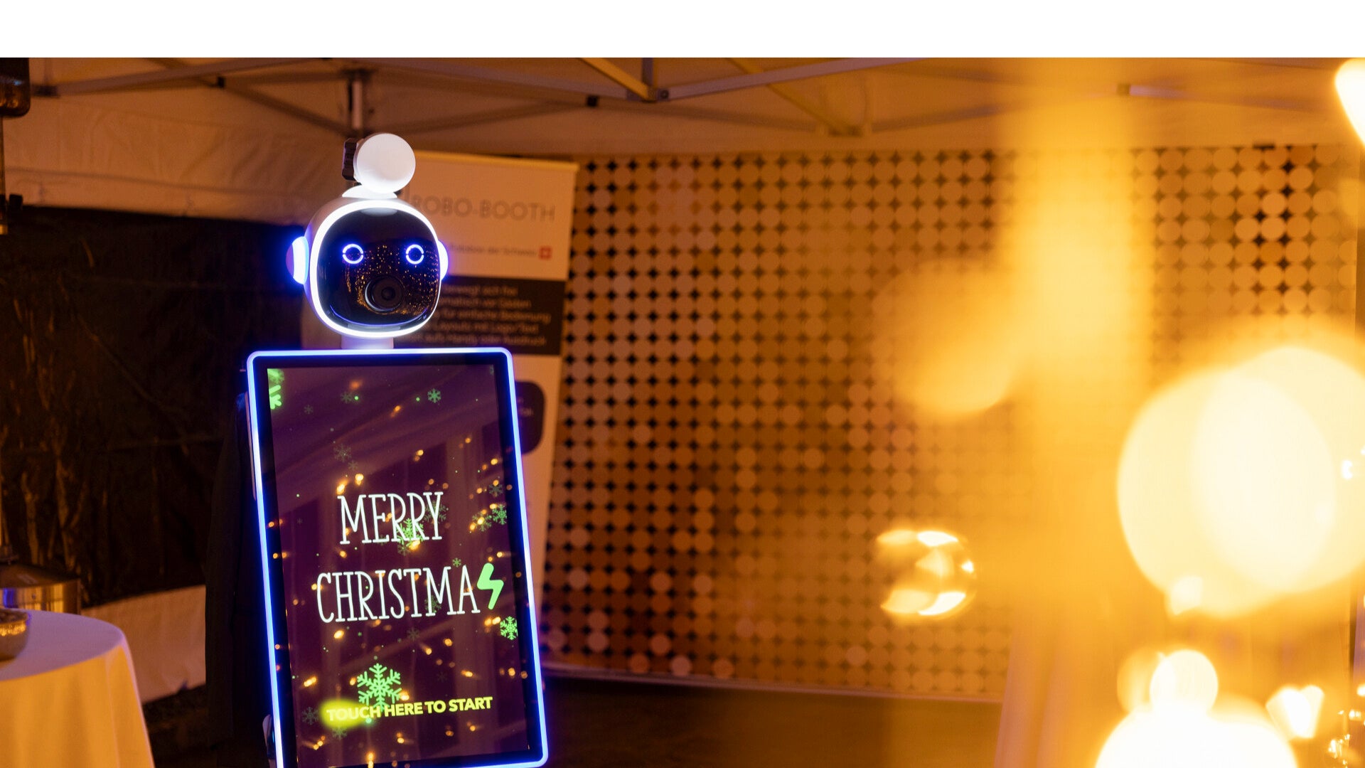 - Robo-Booth rollt durch den Raum und lädt Gäste zum Foto ein.